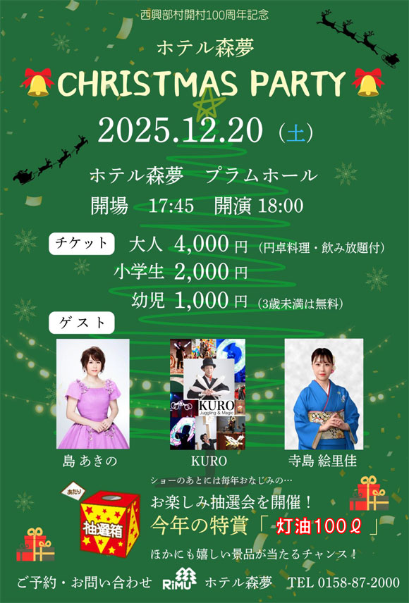 2025/12/20(土)開演18:00~ホテル森夢 プラムホールにてクリスマスパーティーを開催いたします。