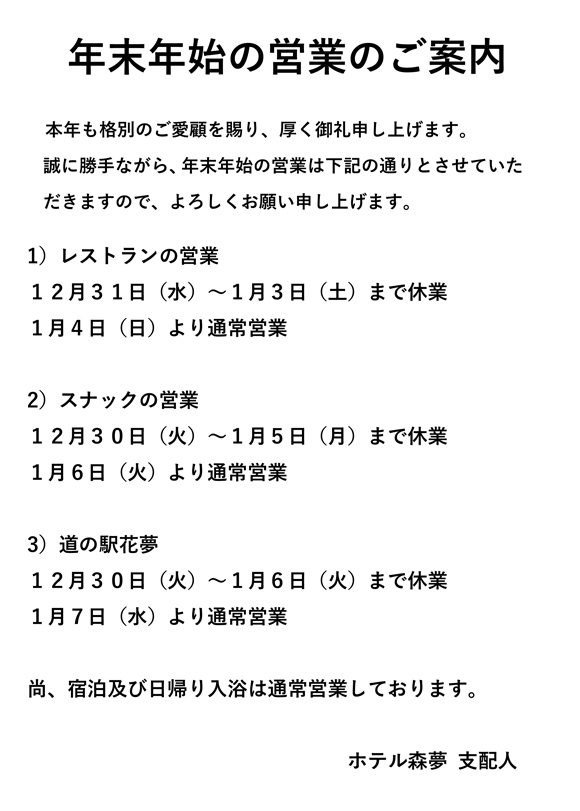 年末年始の営業のご案内